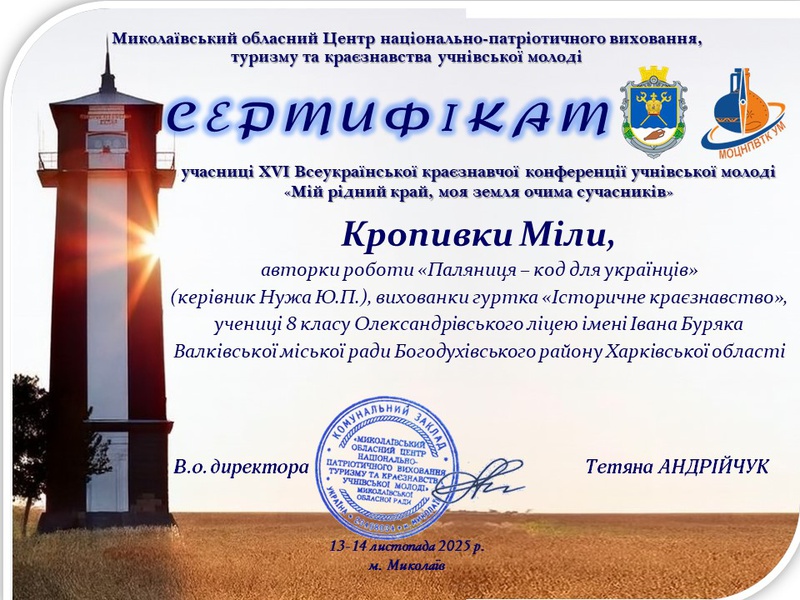 "Мій рідний край, моя земля очима сучасників", в якій взяли участь здобувачі освіти нашого ліцею, вихованці гуртка «Історичне краєзнавство» Кропивка Міла та Ткаченко Ярослав. Виступи учнів відбулися у секціях "Культура рідного краю та музейна справа" та "Етнографічне краєзнавство".