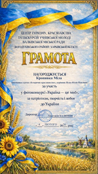 Центр Туризму, краєзнавства та екскурсій учнівської молоді Валківської міської ради нагородив учнів ліцею Грамотами за участь у фотоконкурсі "Україна - це ми!", за патріотизм, творчість і любов до України!