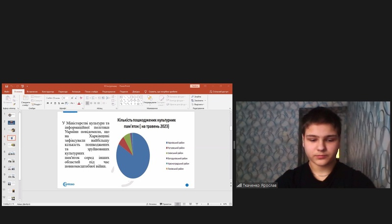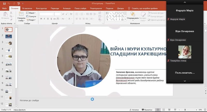 Ткаченко Ярослав, учень 8 класу Олександрівського ліцею імені Івана Буряка, вихованець гуртка «Історичне краєзнавство» Центру туризму, краєзнавства та екскурсій учнівської молоді Валківської міської ради Харківської області взяв участь у ХІХ ВСЕУКРАЇНСЬКОЇ ФІЛОСОФСЬКОЇ ІСТОРИКО-КРАЄЗНАВЧОЇ КОНФЕРЕНЦІЇ УЧНІВСЬКОЇ МОЛОДІ “ПІЗНАЙ СЕБЕ, СВІЙ РІД, СВІЙ НАРІД”. Він представив роботу «ВІЙНА І МУРИ КУЛЬТУРНОЇ СПАДЩИНИ ХАРКІВЩИНИ», в якій висвітлив культурні втрати під час війни.